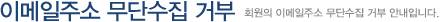 회원에게 무차별적으로 보내지는 타사의 메일을 차단하기 위해, 본 웹사이트에 게시된 이메일 주소가 전자우편 수집 프로그램이나 그 밖의 기술적 장치를 이용하여 무단으로 수집되는 것을 거부하며, 이를 위반시 정보통신망법의해 형사처벌됨을 유념하시기 바랍니다